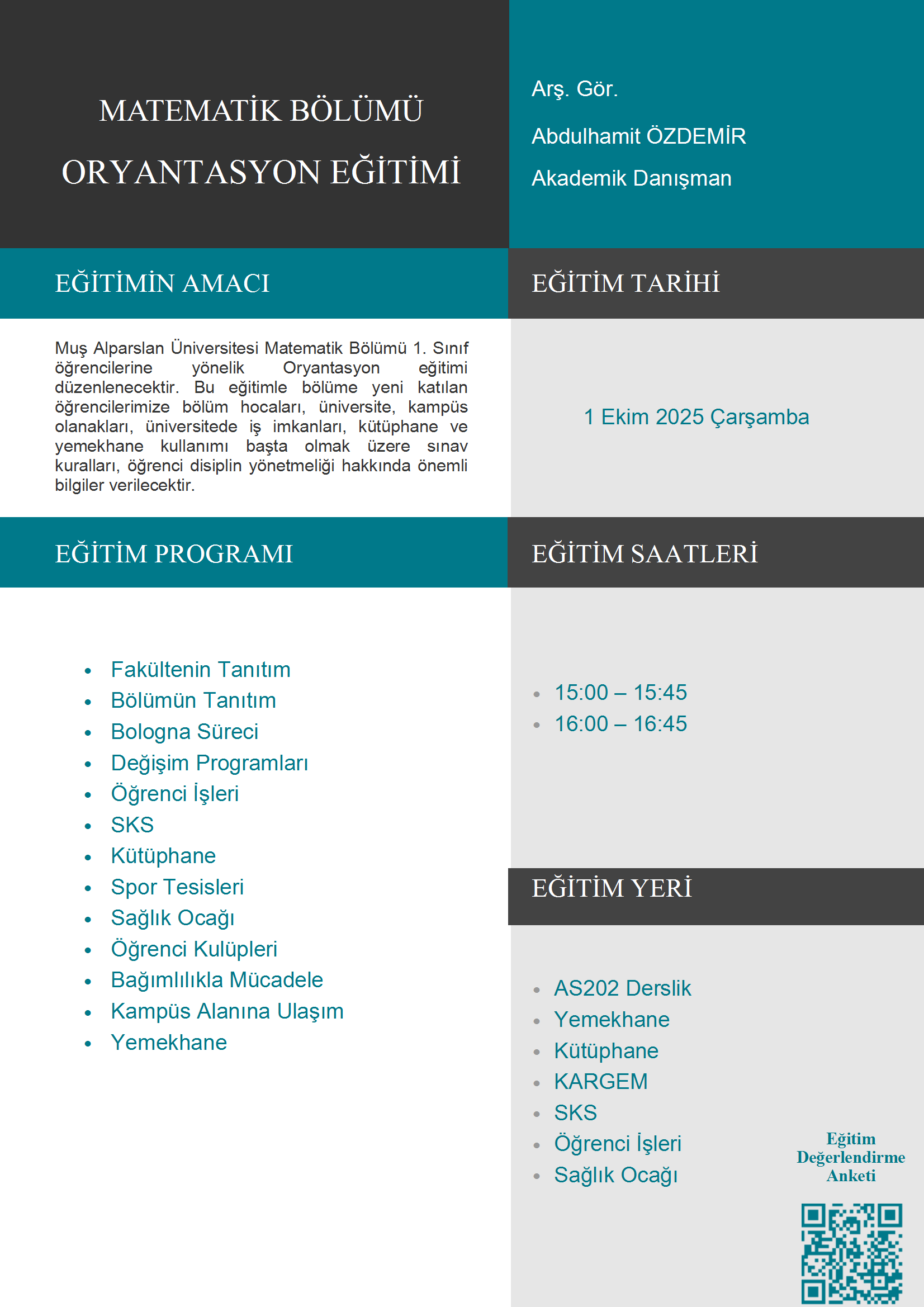 Muş Alparslan Üniversitesi Matematik Bölümü 1. Sınıf öğrencilerine yönelik Oryantasyon eğitimi düzenlendi. Bu eğitimle bölüme yeni katılan öğrencilerimize bölüm hocaları, üniversite, kampüs olanakları, üniversitede iş imkanları, kütüphane ve yemekhane kullanımı başta olmak üzere sınav kuralları, öğrenci disiplin yönetmeliği hakkında önemli bilgiler verildi.